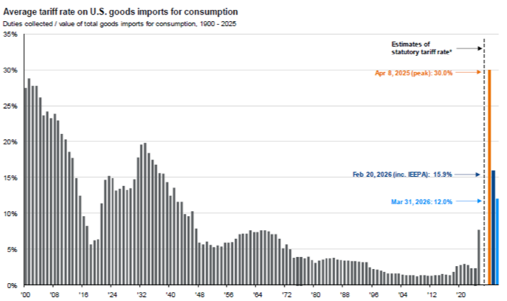 The global energy shock, along with the President’s tariffs imposed on our global trade partners have reignited concerns about inflation. Although the Supreme Court struck down much of President Trump’s “liberation day” tariffs, he has levied new tariffs under different temporary actions. As the chart below shows, the average tariff rate now stands at around 12%, down from the 30% peak a year ago, but still far higher than the pre “liberation day” level of about 4%, and the highest average rate since the 1940’s. As of the last reading in February, inflation was about 2.4%, this is expected to rise in the coming months as higher energy prices work their way through the economy. In the short‐term, inflation is expected to rise. In the longer‐term, strategists are hopeful inflation will drift back down to about 2%.